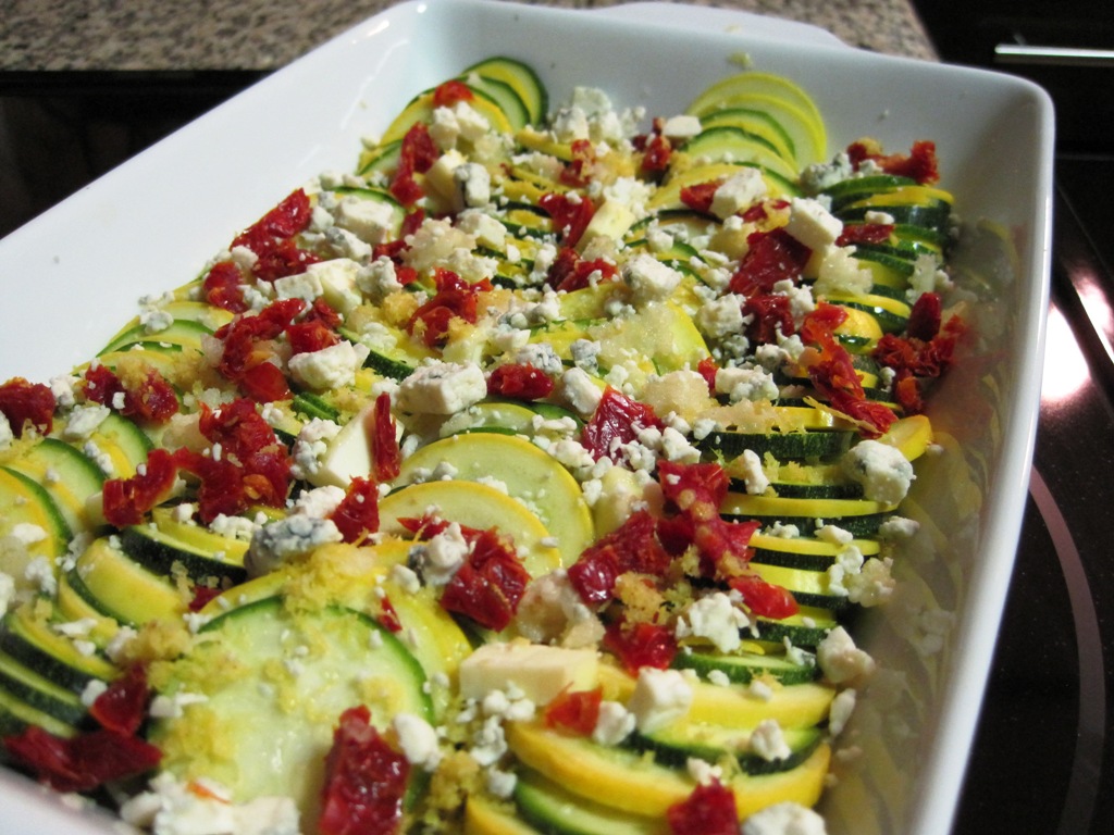 I started with three small yellow and two green zucchini, and sliced them just as thin as I could without much endangering my non-existent manicure. Now, I understand that Ratatouille is supposed to have tomatoes, too. The problem being, I hate fresh tomatoes. Ketchup, Pasta Sauce, even Sun-dried tomatoes I can handle. Fresh ones, or even chunky Pasta Sauce? No go. Nasty, disgusting little things. So, I used sun-dried instead, and treated them as an accent.